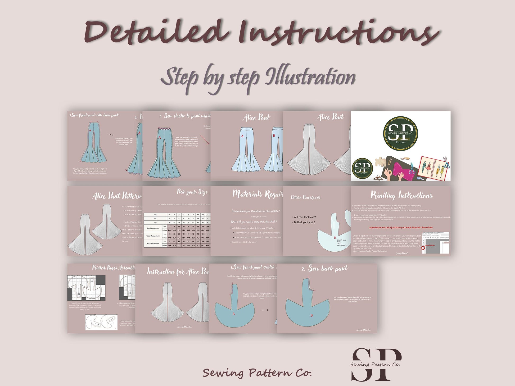 The ALICE Pant sewing pattern is a boho-inspired, stretchy, and flairy design thatâs equal parts comfort and style. Perfect for everyday wear, yoga, lounging, or festivals, this womenâs pant pattern is made for soft, stretch fabrics like jersey or rib knit. With 15 sizes included, from XXXS to 5XL, youâll be sure to get the perfect fit.