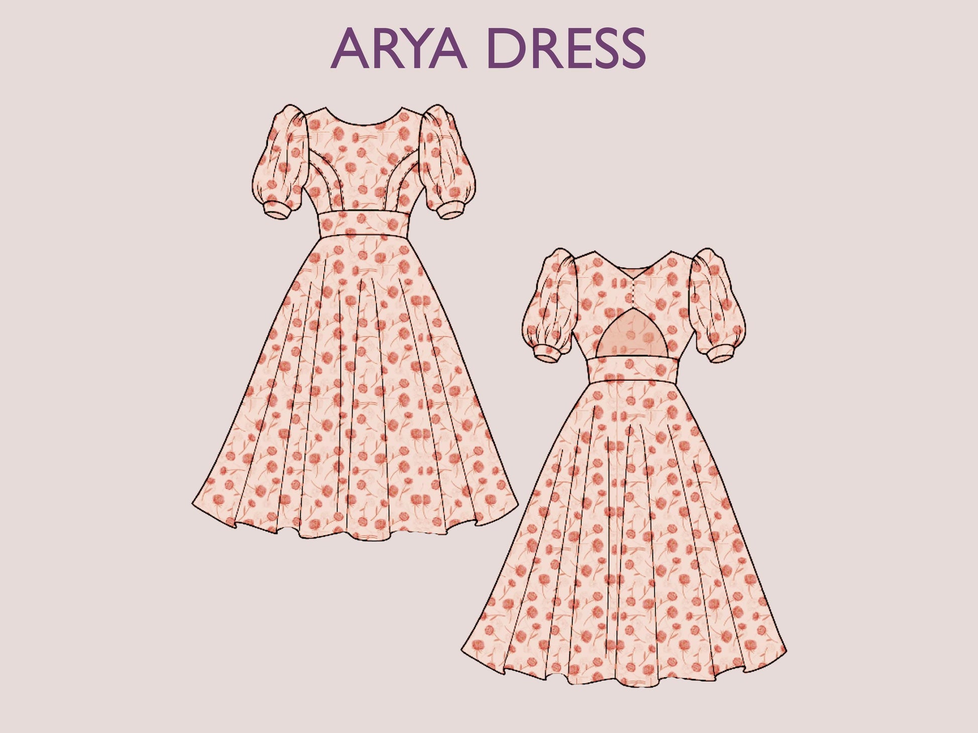The bodice features a fitted front for a graceful silhouette and a striking back cut-out that adds flair to an otherwise classic design. The ARYA dress is suitable for confident beginners and intermediate sewists, with easy instructions and multiple paper formats included.