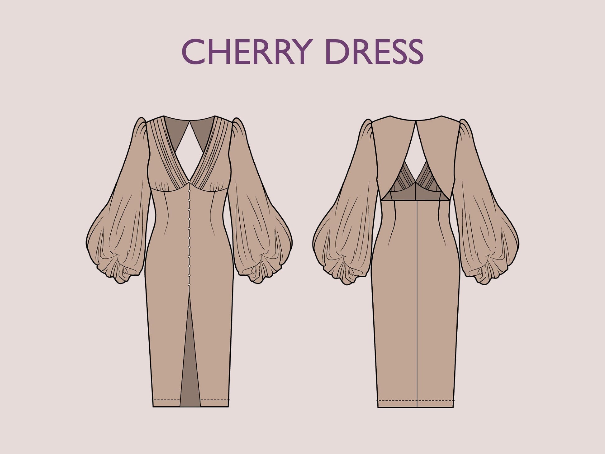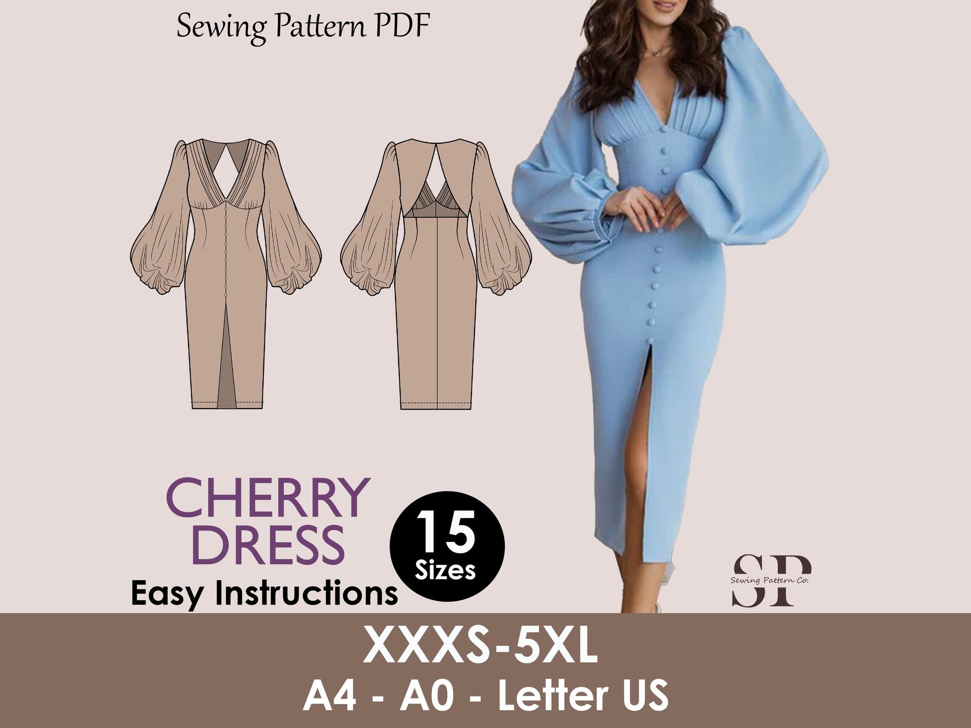 🍒 CHERRY Dress – Puffy Sleeve V-Neck Fancy Dress Sewing Pattern (Digital PDF – 15 Sizes XXXS to 5XL)