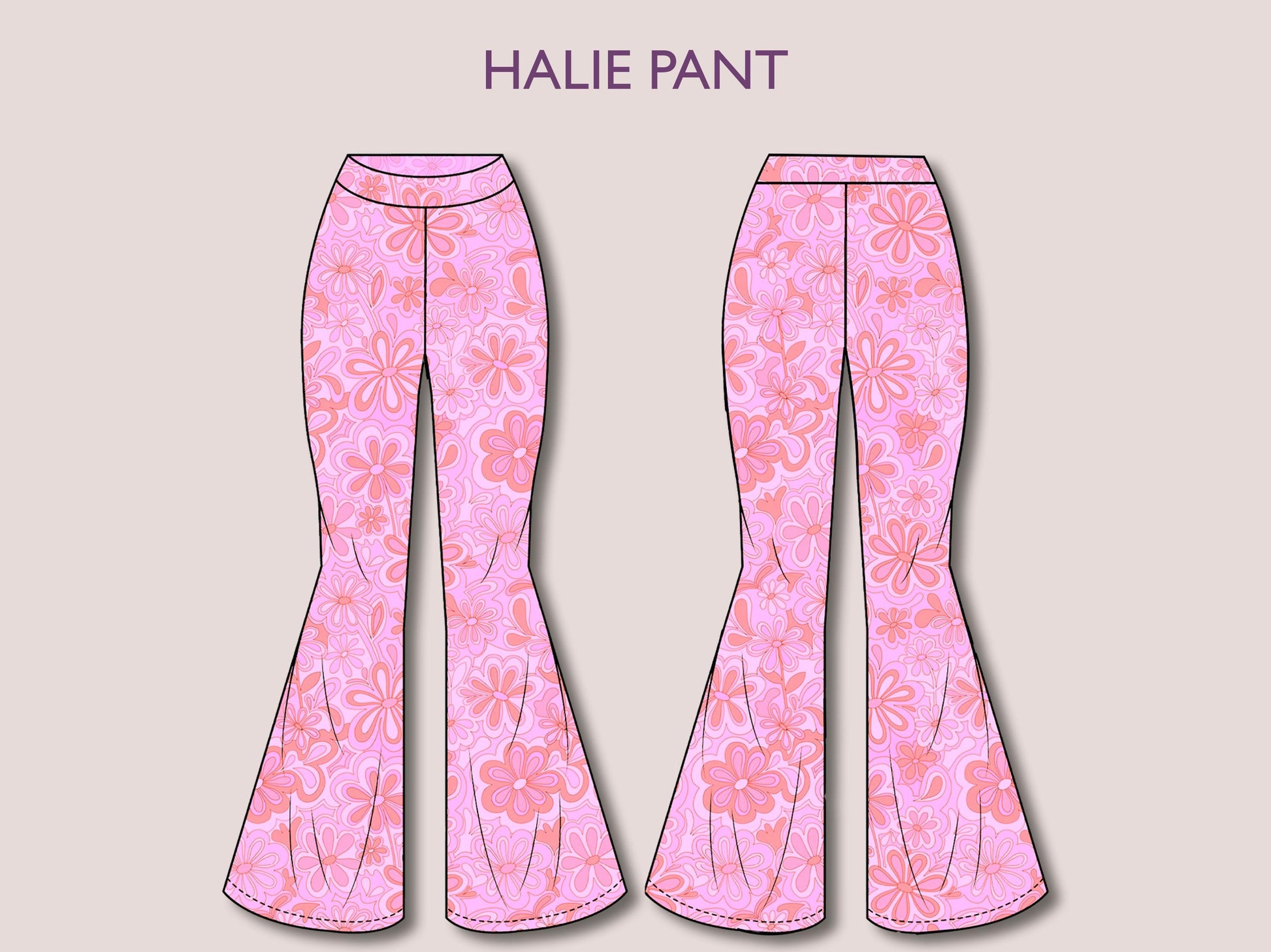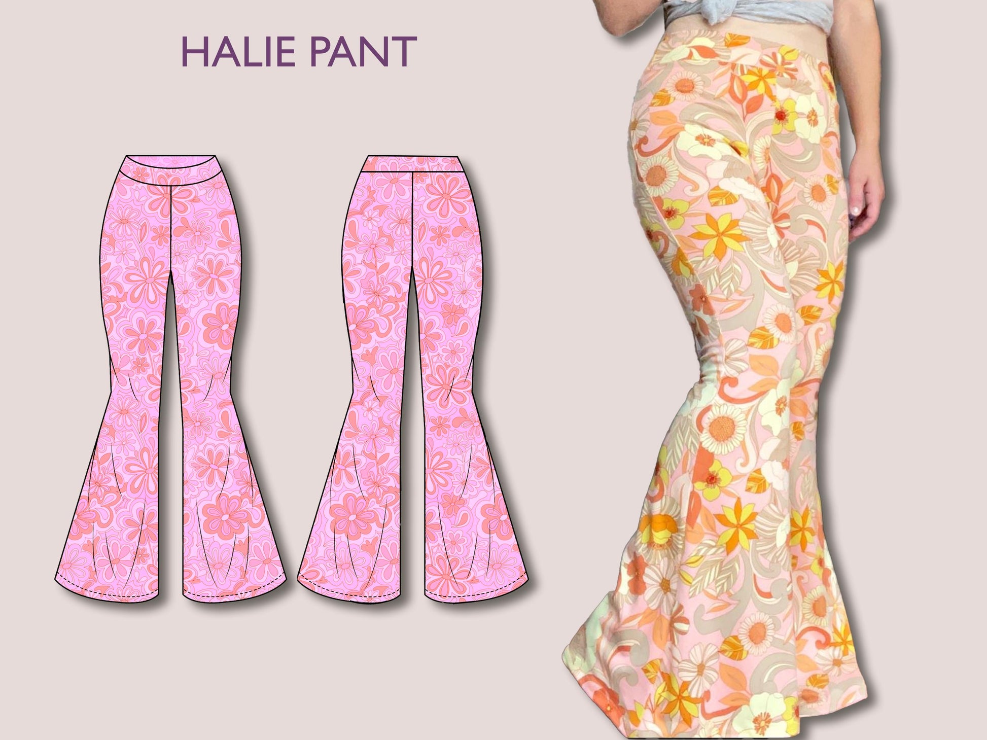 Add some flair to your wardrobe with the HALIE Pant! This women's stretchy pant sewing pattern features a flattering high waist, body-hugging fit through the hips and thighs, and a dramatic flared leg. Perfect for retro vibes or comfy modern wear, this DIY project is beginner-friendly and designed for knit/stretch fabrics.