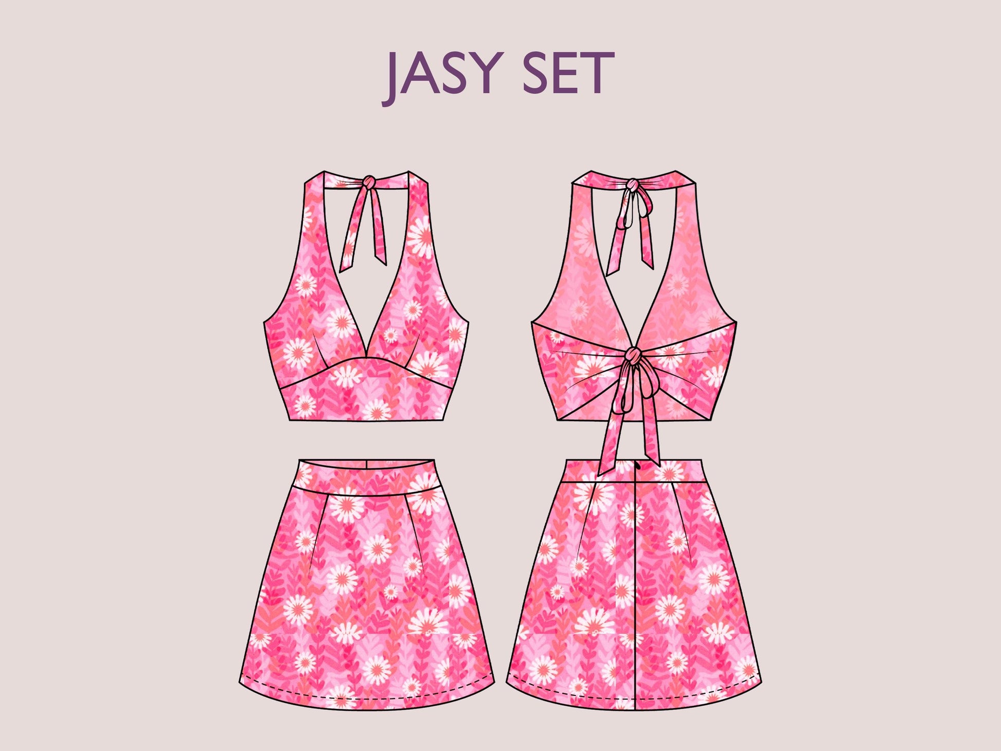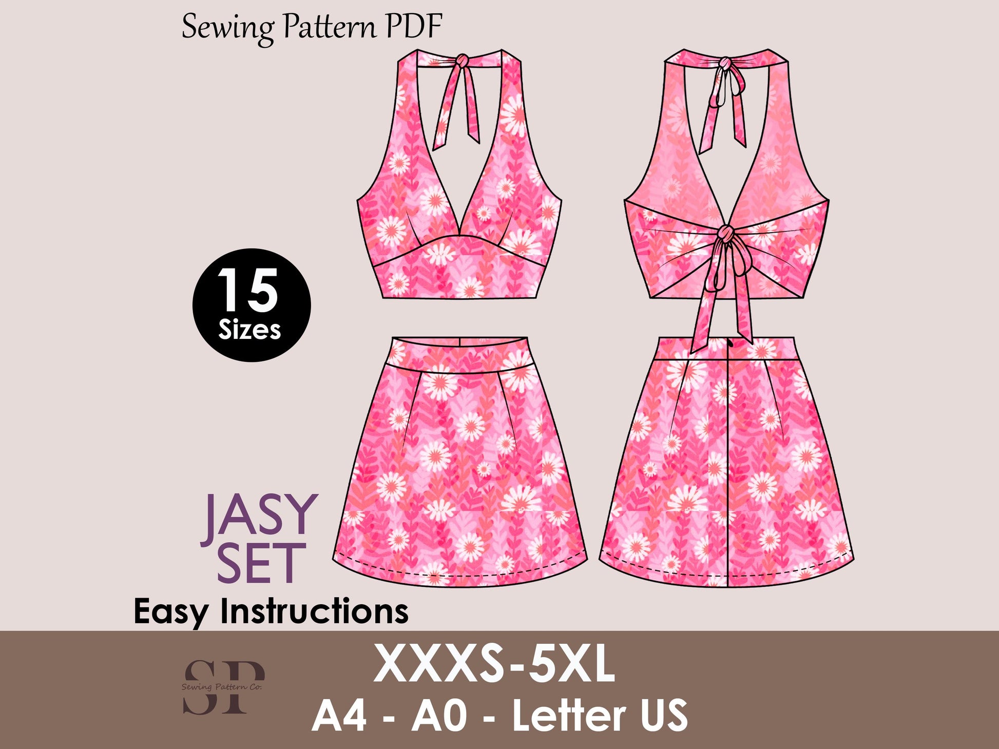 ☀️ JASY Set – Halter Crop Top & Skirt Sewing Pattern PDF | Summer Co-Ord Outfit | Tie-Back Top | 15 Sizes Included