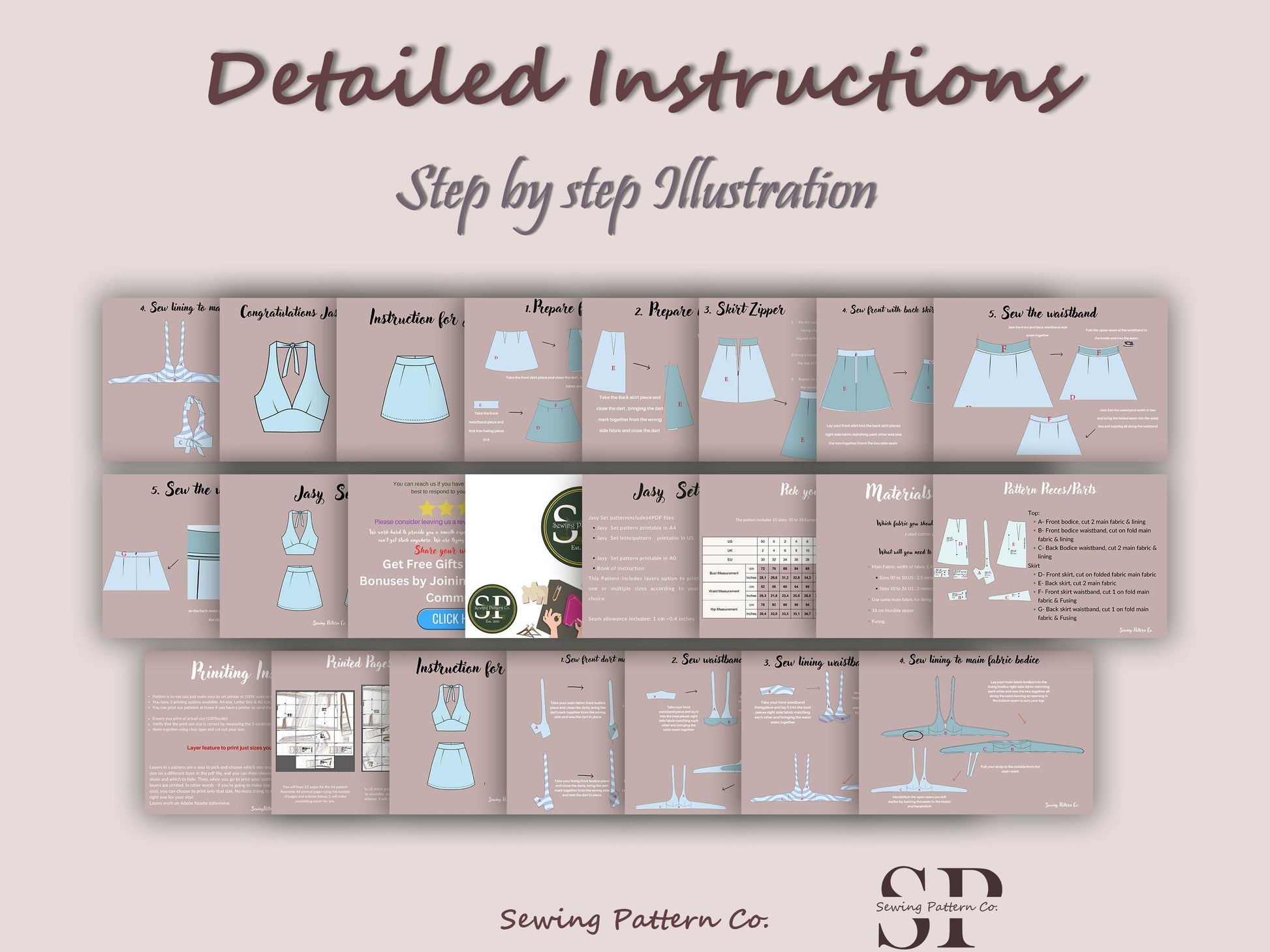 JASY Set - Halter crop top | dress set | Tie-back crop top deep neckline | Sleeveless, Short skirt| Women Summer set sewing Pattern PDF