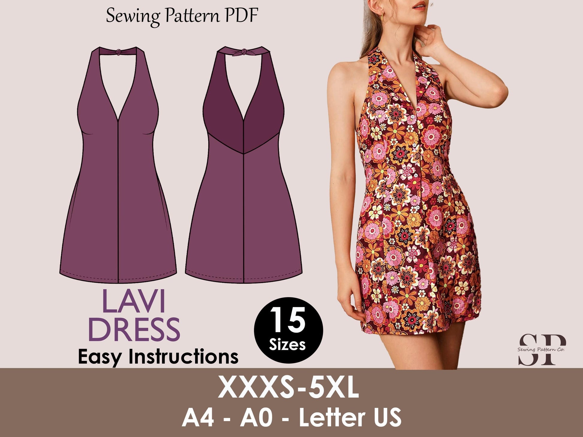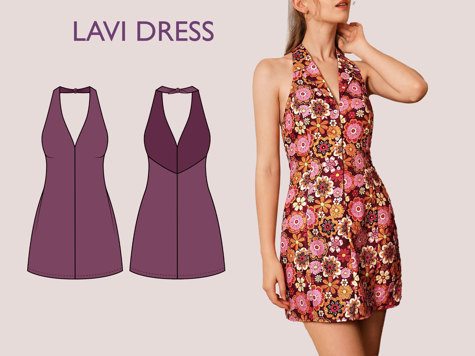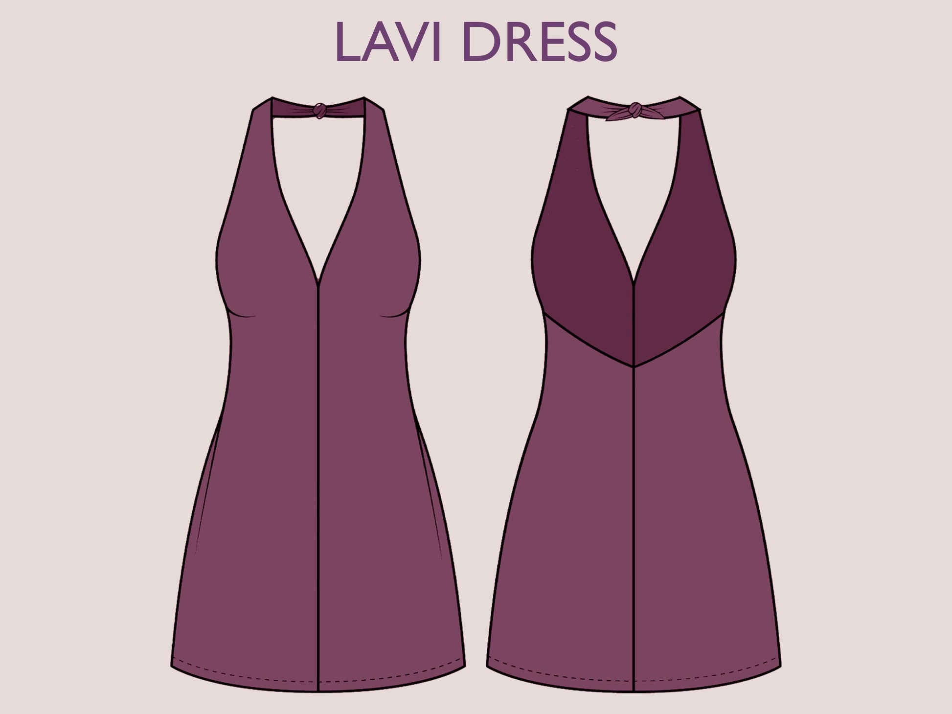 LAVI Dress Sewing Pattern PDF – Halter Neck Mini Dress – Tie Back Sundress – Open Back Dress – Sleeveless Summer Dress – Digital Download