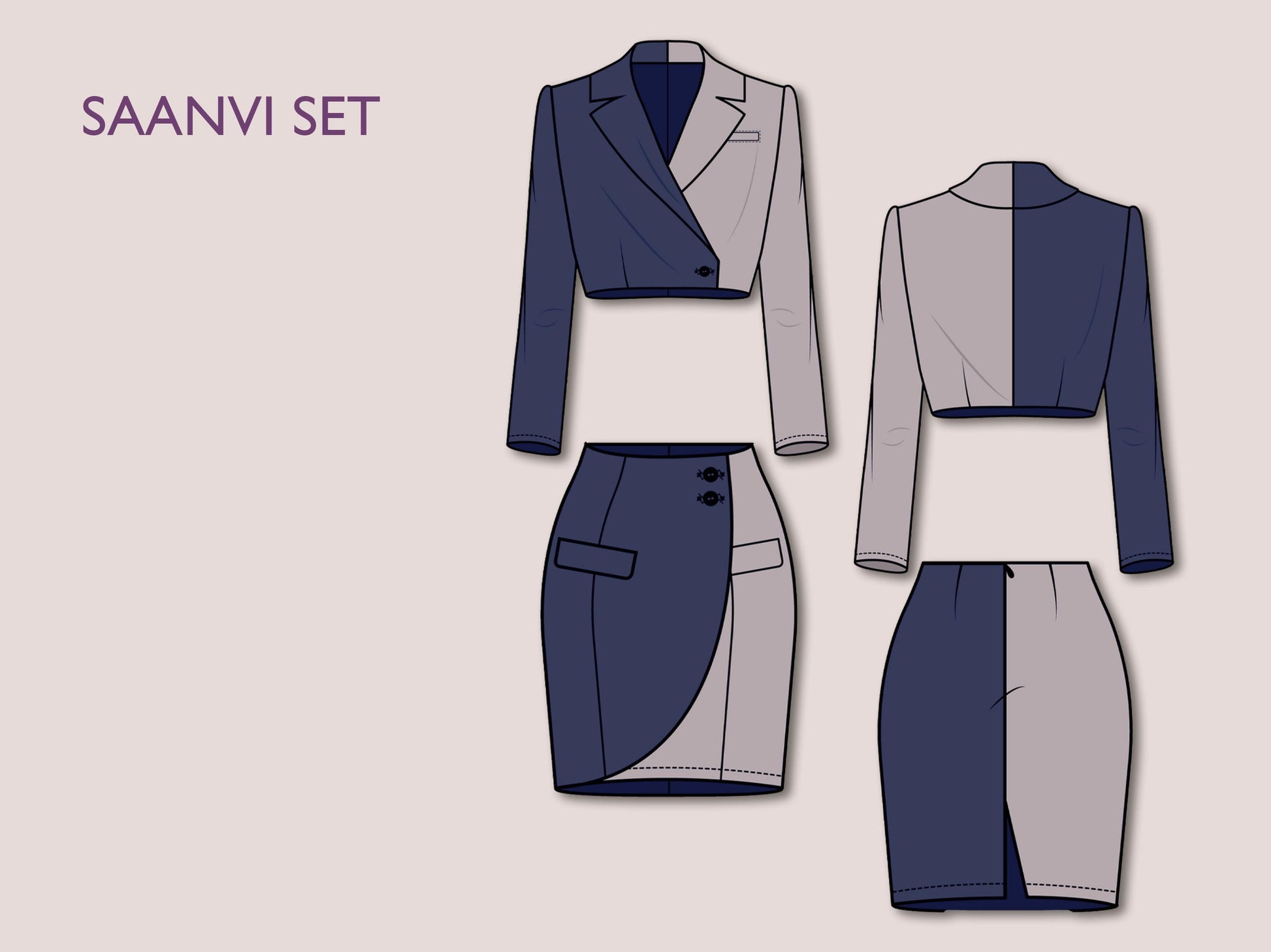 The SAANVI Set combines modern tailoring with bold style! This women’s sewing pattern includes a statement cropped blazer with lapels and a wrap skirt with pocket detailing. Perfect for creating your own chic, fashionable co-ord suit set.