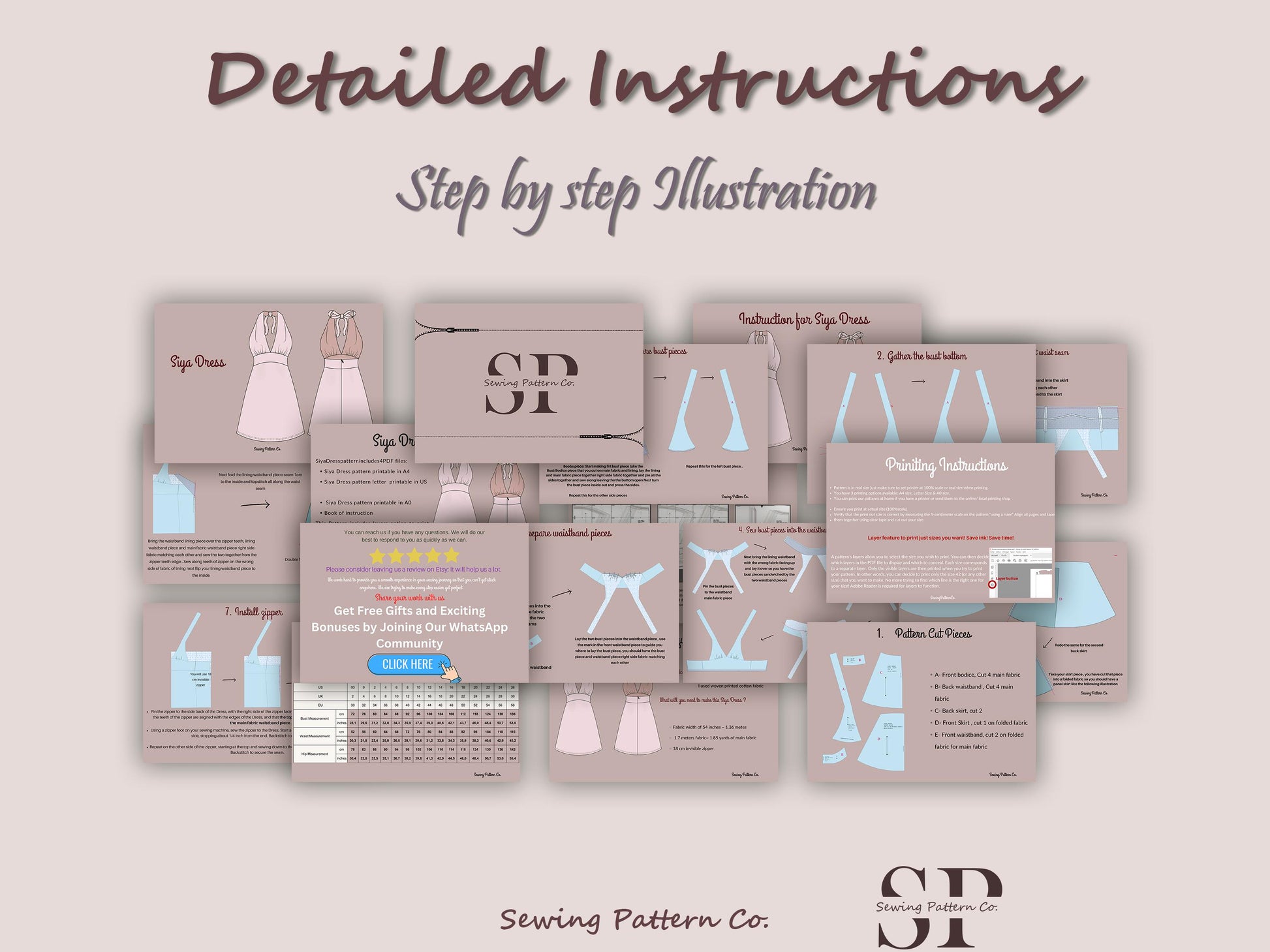 This digital sewing pattern features a halter neckline, deep V bustier bodice, and a backless tie design, giving it a flattering and flirty look. Designed for confident beginners and up, this pattern is available in 15 sizes (XXXS–5XL) and formatted for A4, A0, and US Letter paper.